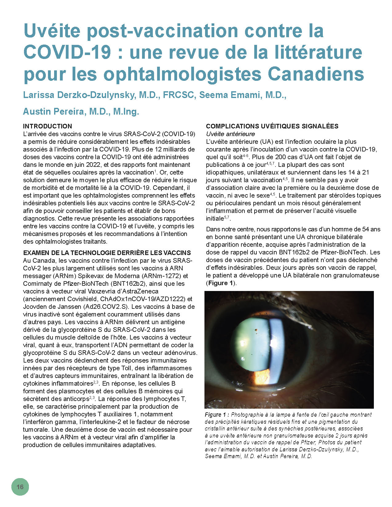 - Uvéite post-vaccination contre la COVID-19 : Une revue de la littérature pour les ophtalmologistes Canadiens